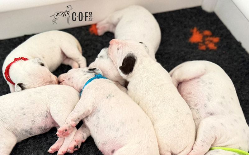 Unser R-Wurf entwickelt sich einfach zauberhaft. Vor wenigen Tagen haben die Welpen begonnen, ihre Augen zu öffnen, und seitdem gibt es kein Halten mehr: Auf noch wackeligen Beinchen wird die Wurfbox erkundet, kleine Schritte werden geübt und jeden Tag wirkt alles ein Stückchen sicherer. Die Punkte sind inzwischen wunderschön zu erkennen – einer ist hübscher als der andere. Aber gut, das sagt wahrscheinlich jede Hundemama 😊