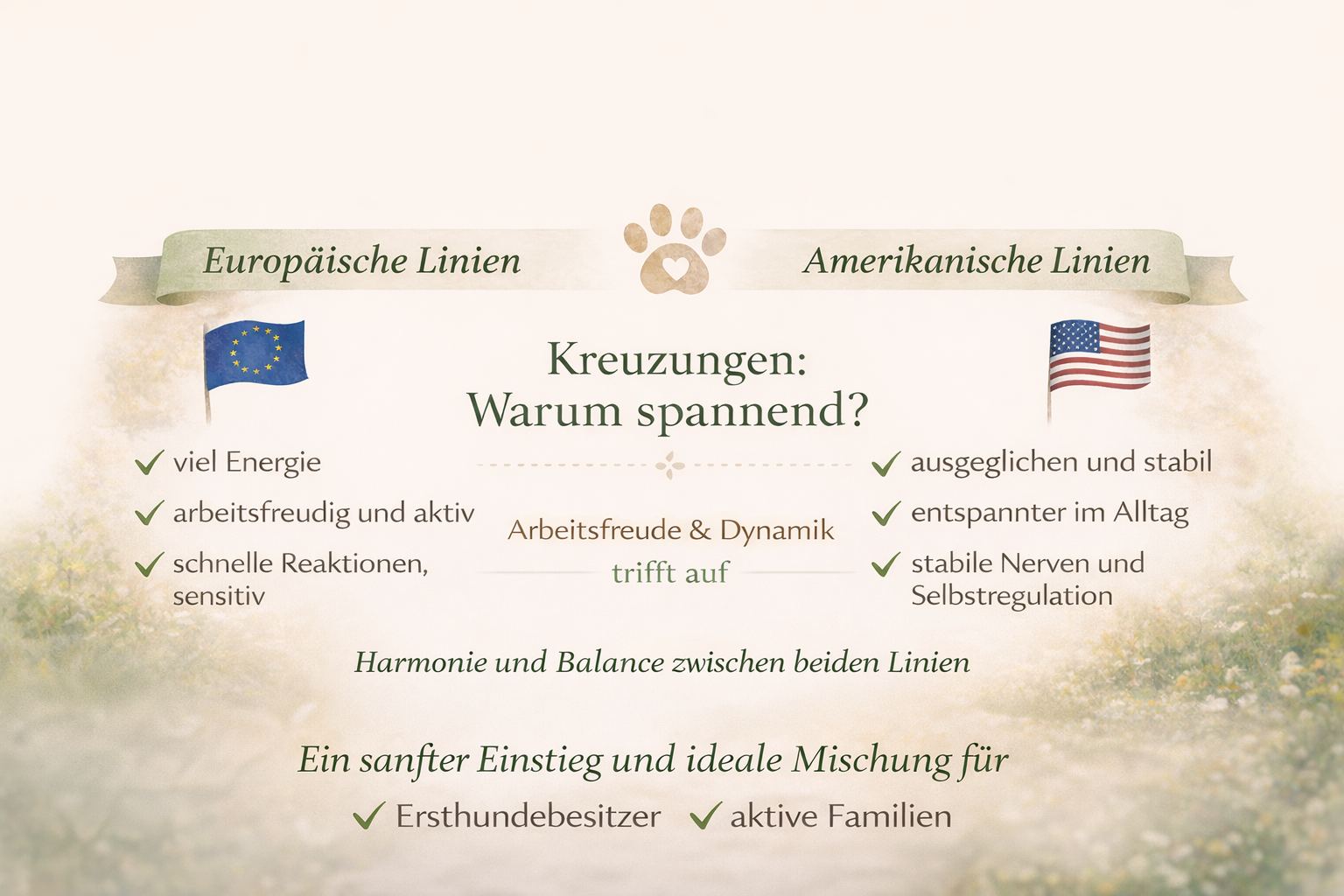 Innerhalb der Rasse gibt es feine Unterschiede im Charakter – besonders zwischen europäischen und amerikanischen Linien. Diese Unterschiede sind keine Wertung, sondern Ausdruck verschiedener Zuchtschwerpunkte, die sich über viele Jahre entwickelt haben.
